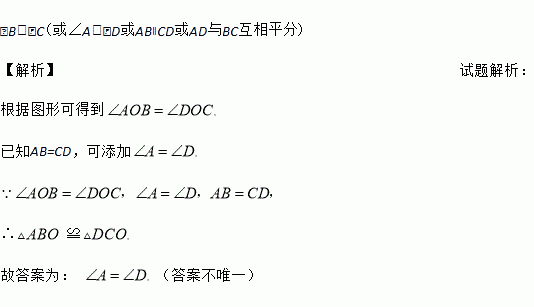 如图所示,AB=CD,AD,BC相交于点O,要使ΔABO≌ΔDCO,应添加的条件为________.(只需写一个)