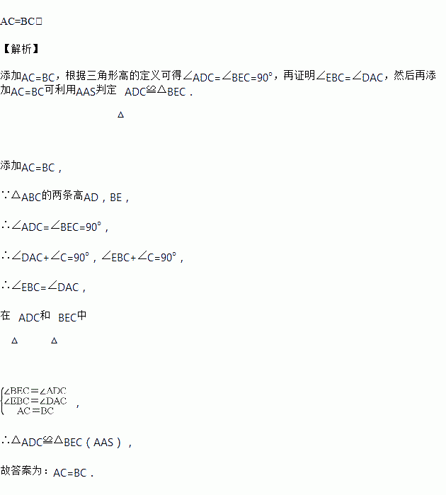 如图,△ABC的两条高AD,BE相交于点F,请添加一个条件,使得△ADC≌△BEC(不添加其他字母及辅助线),你添加的条件是_____.