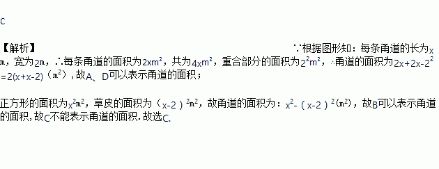如图,某小区规划在边长为x m的正方形场地上,修建两条宽为2 m的通道,其余部分种草,以下各选项所列式子不是计算通道所占面积的为( )
