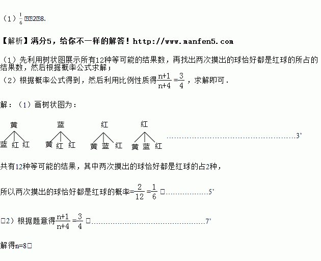 (1)任意摸出1个球,记下颜色后不放回,再任意摸出1个球.求两次摸出的球恰好都是红球的概率(要求画树状图或列表);