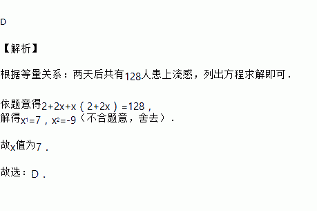 流感传染性很强,一天内一人可传染x人,若先有2人同时患上流感,两天后共有128人患上流感,则x的值为( )