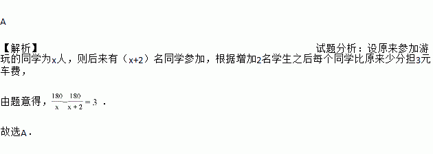 “五一”期间,几名同学包租一辆面包车前去某景区旅游,面包车的租价为180元,出发时又增加了两名同学,结果每个同学比原来少摊了3元钱车费,设参加游览的同学共x人,则所列方程为( )