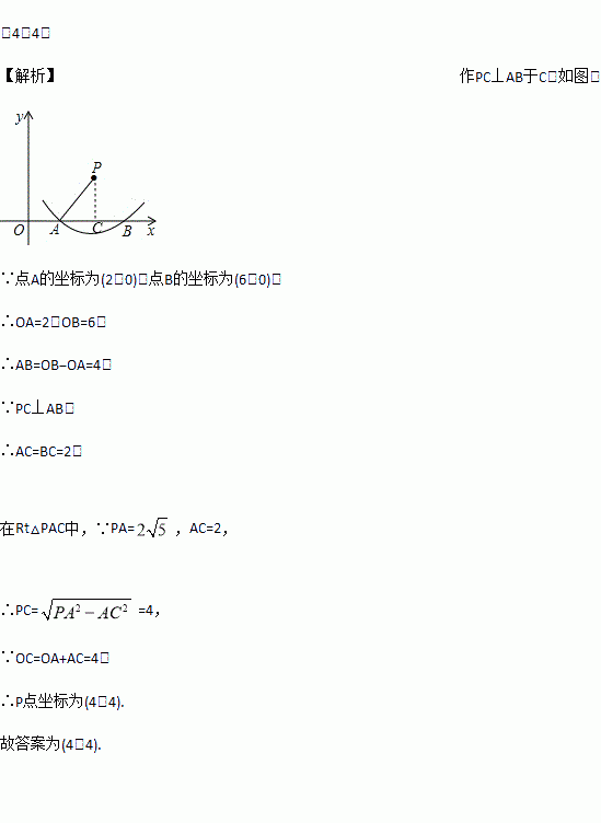如图,以点P为圆心,以为半径的圆弧与x轴交于A,B两点,点A的坐标为(2,0),点B的坐标为(6,0),则圆心P的坐标为___________