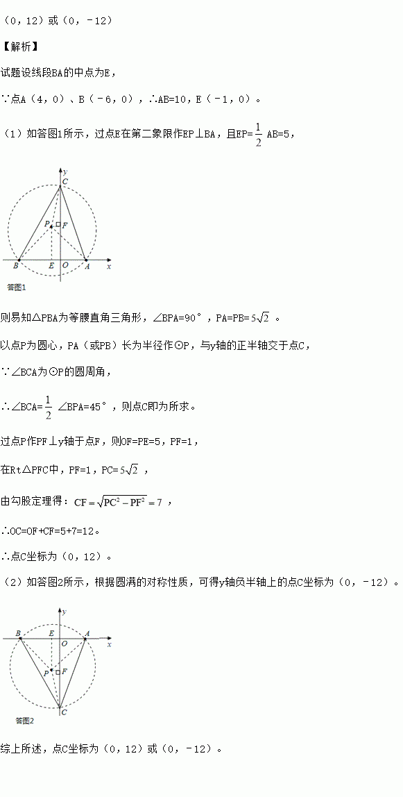 在平面直角坐标系中,已知点A(4,0)、B(﹣6,0),点C是y轴上的一个动点,当∠BCA=45°时,点C的坐标为 .