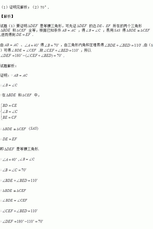 (2)当∠A=40°时,求∠DEF 的度数.