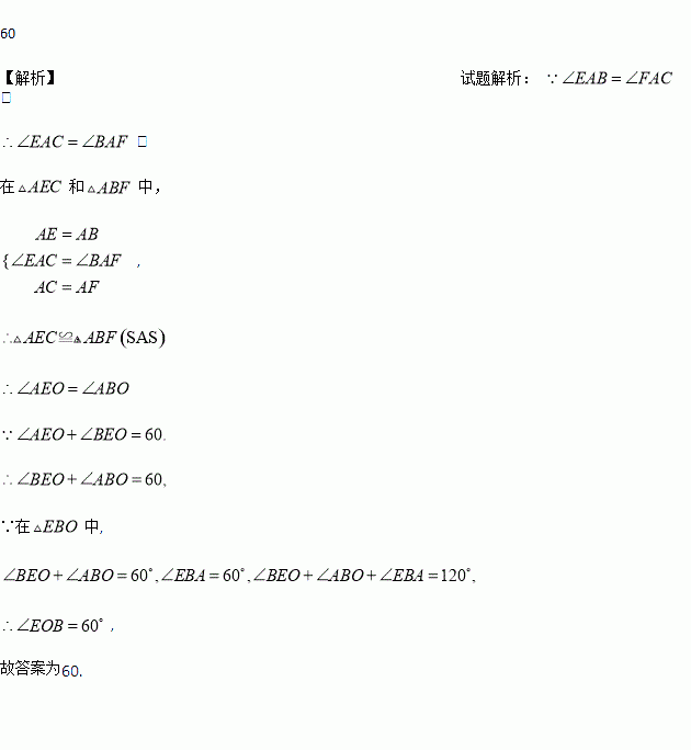 如图,△ABE 和△ACF分别是以△ABC的AB、AC为边的等边三角形,CE、BF相交于O,则∠EOB=