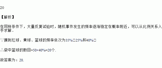 口袋中有红色、黄色、蓝色玻璃球共个,小明通过多次摸球试验后,发现摸到红球、黄球、蓝球的频率依次为,和,则袋中蓝球的数目是________个.