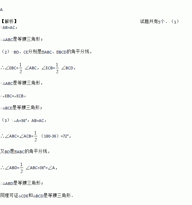 如图,在△ABC中,AB=AC,∠A=36°,BD、CE分别是∠ABC、∠BCD的角平分线,则图中的等腰三角形有( )