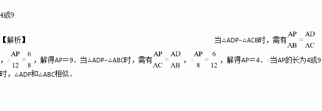 如图,已知△ABC中,D为边AC上一点,P为边AB上一点,AB=12,AC=8,AD=6,当AP的长度为__时,△ADP和△ABC相似.