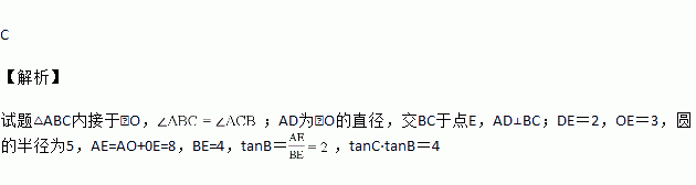 如图,△ABC内接于⊙0,AD为⊙0的直径,交BC于点E,若DE=2,0E=3,则tan∠ACB·tan∠ABC=( )