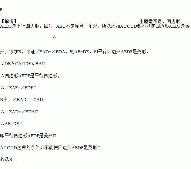 在△ABC中,AB≠AC,D是边BC上一点,DE∥CA交AB于点E,DF∥BA交AC于点F.要使四边形AEDF是菱形,只需添加条件( )