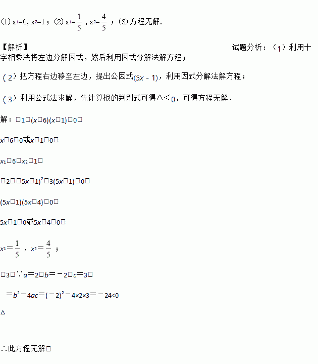 (1)x1=6,x2=1;(2)x1=,x2=;(3)方程无解. 【解析】试题分析:(1)利用十字相乘法将左边分解因式,然后利用因式分解法解方程; (2)把方程右边移至左边,提出公因式(5x-1),利用因式分解法解方程; (3)利用公式法求解,先计算根的判别式可得△<0,可得方程无解. 【解析】 (1)(x-6)(x-1)=0, x-6=0或x-1=0, x1...