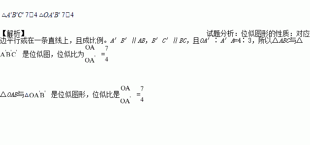 已知,如图2,A′B′∥AB,B′C′∥BC,且OA′∶A′A=4∶3,则△ABC与________是位似图形,位似比为________;△OAB与________是位似图形,位似比为________.