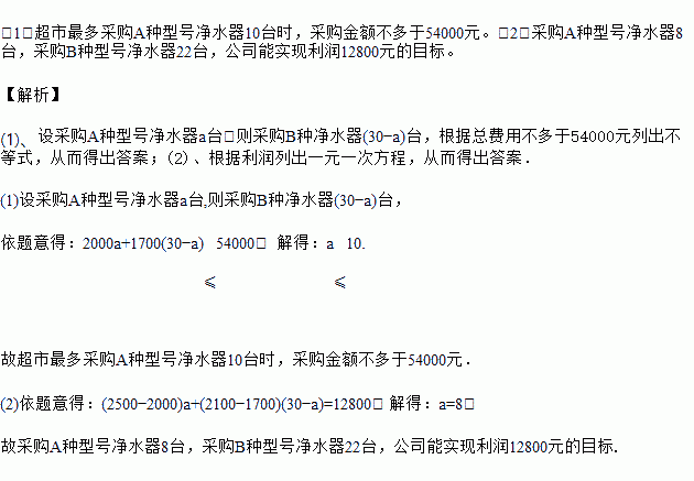 (1)若电器公司准备用不多于54000元的金额在采购这两种型号的净水器共30台,求A种型号的净水器最多能采购多少台?