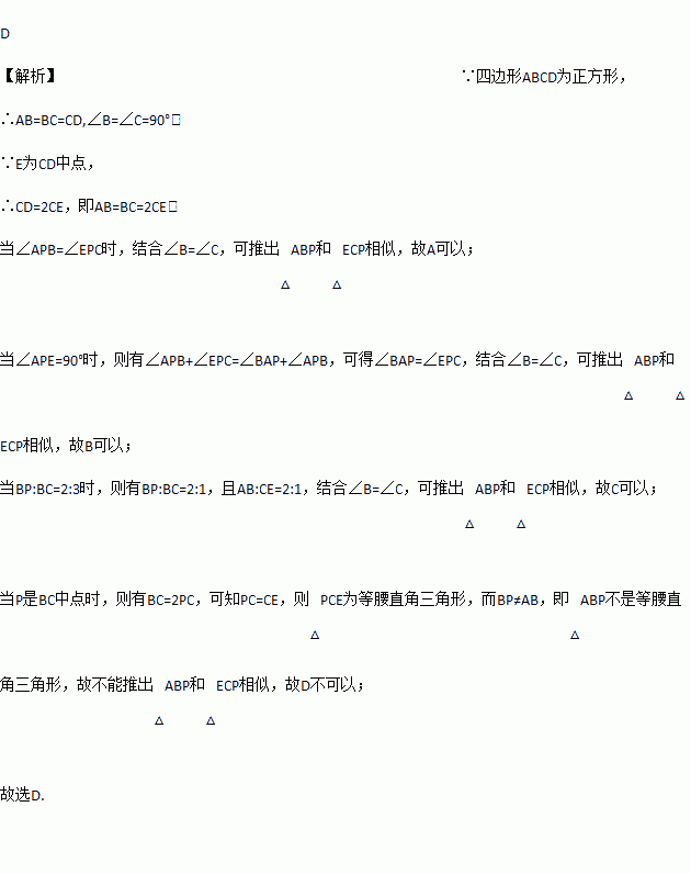 如图,正方形ABCD中,E是CD的中点,P是BC边上的一点,下列条件中,不能推出△ABP和△ECP相似的是( )