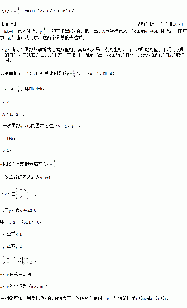 (2)求出这两个函数图象的另一个交点B的坐标,并根据图象写出使反比例函数的值大于一次函数的值的x的取值范围.