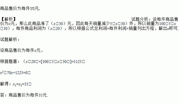 ÉÌÆ·ÊÛ¼ÛΪÿ¼þ35Ôª. ¡¾½âÎö¡¿ÊÔÌâ·ÖÎö£ºÉèÿ¼þÉÌÆ·ÊÛ¼ÛΪxÔª£¬ÄÇô´ËÉÌÆ·ÕÇÁË£¨x£30£©Ôª£¬Òò´ËÿÌìÏúÁ¿¼õÉÙ5£¨x£30£©¼þ£¬ËùÒÔÏúÁ¿Îª100£5£¨x£30£©£¬Ã¿¼þÉÌÆ·ÀûÈóΪ£¨x£20£©£¬ËùÒÔ¸ù¾Ý¹«Ê½×ÜÀûÈó=ÿ¼þÀûÈó¡ÁÏúÁ¿Áгö·½³Ì£¬½â³öx¼´¿É. ÊÔÌâ½âÎö£º ÉèÉÌÆ·ÊÛ¼ÛΪÿ¼þxÔª£¬ ¸ù¾ÝÌâÒ⣺£¨x£20£©¡Á[100£5£¨x£30£©]=1125£¬ x2£70x+1225...