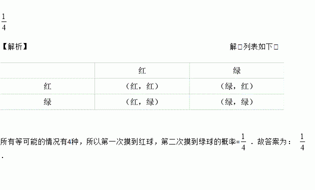 不透明袋子中装有红、绿小球各一个,除颜色外无其他差别,随机摸出一个小球后,放回并摇匀,再随机摸出一个,则第一次摸到红球,第二次摸到绿球的概率为__.