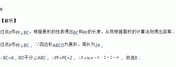 如图,点P是菱形ABCD对角线BD上一点,PE⊥AB于点E,且PE=2.连接PC,若菱形的周长为24.则△BCP的面积为( )