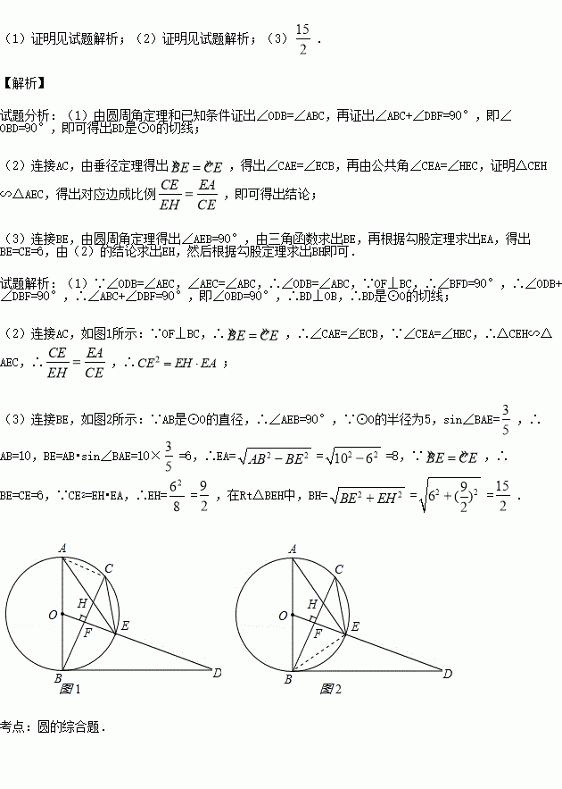 已知,如图,AB是⊙O的直径,点C为⊙O上一点,OF⊥BC于点F,交⊙O于点E,AE与BC交于点H,点D为OE的延长线上一点,且∠ODB=∠AEC.