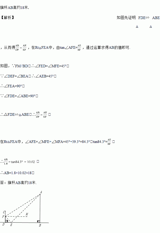 为了测量竖直旗杆AB的高度,某综合实践小组在地面D处竖直放置标杆CD,并在地面上水平放置个平面镜E,使得B,E,D在同一水平线上,如图所示.该小组在标杆的F处通过平面镜E恰好观测到旗杆顶A(此时∠AEB=∠FED).在F处测得旗杆顶A的仰角为39.3°,平面镜E的俯角为45°,FD=1.8米,问旗杆AB的高度约为多少米? (结果保留整数)(参考数据:tan39.3°≈0.82,tan84.3°≈10.02)