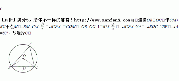 如图,△ABC内接于⊙O,⊙O的半径为1,BC=,则∠A的度数为( )