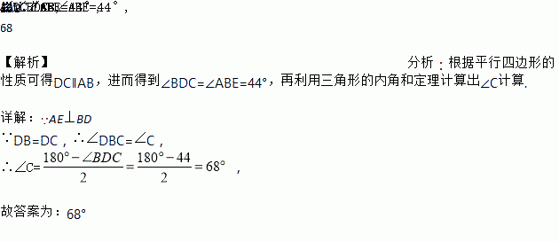 如图,在□ABCD中,DB=DC,AE⊥BD,垂足为E,若∠EAB=46°,则∠C=______°.