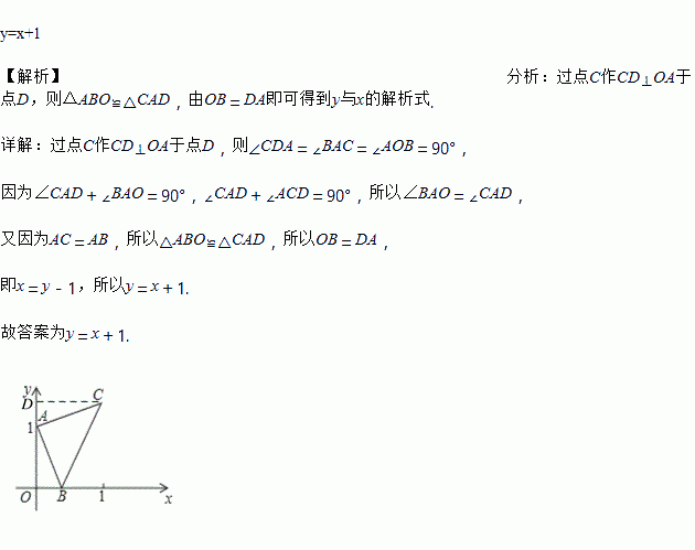 如图,点A的坐标为(0,1),点B是x轴正半轴上的一动点,以AB为边作等腰直角△ABC,使∠BAC=90°,设点B的横坐标为x,点C的纵坐标为y,则y与x的解析式是_____.