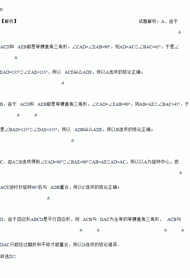 如图,△ACD和△AEB都是等腰直角三角形,∠CAD=∠EAB=90°,四边形ABCD是平行四边形,下列结论错误的是( )