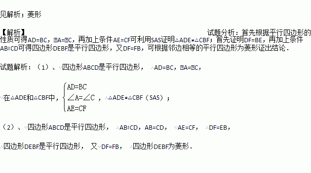 (2)若DF=BF,求证:四边形DEBF为菱形.