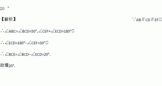 如图,AB∥CD∥EF,若∠ABC=50°,∠CEF=150°,则∠BCE=_______.