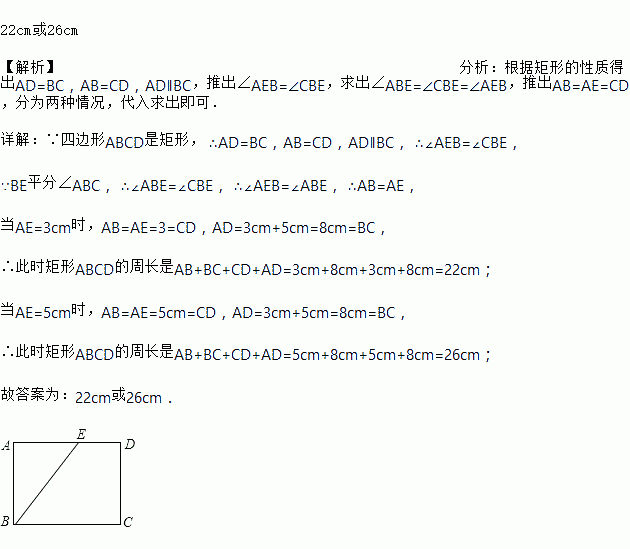 若矩形的一个内角的平分线把矩形的一条边分成3cm和5cm的两段,则该矩形的周长为________.