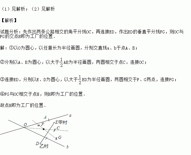 (1)见解析;(2)见解析 【解析】 试题分析:先作出两条公路相交的角平分线OC,再连接ED,作出ED的垂直平分线FG,则OC与FG的交点H即为工厂的位置. 【解析】 ①以O为圆心,以任意长为半径画圆,分别交直线a、b于点A、B; ②分别以A、B为圆心,以大于AB为半径画圆,两圆相交于点C,连接OC; ③连接ED,分别以E、D为圆心,以大于ED为半径画圆,两圆相交于...