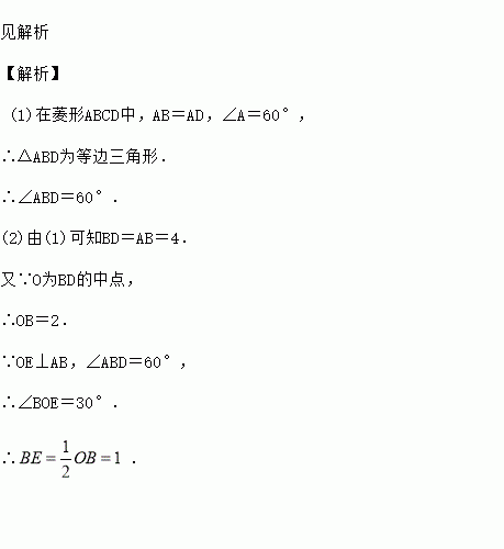 如图,在菱形ABCD中,∠A=60°,AB=4,O为对角线BD的中点,过O点作OE⊥AB,垂足为E.