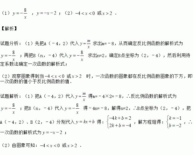 (1),;(2)或. 【解析】 试题分析:(1)先把A(﹣4,2)代入求出m=﹣8,从而确定反比例函数的解析式为;再把B(n,﹣4)代入求出n=2,确定B点坐标为(2,﹣4),然后利用待定系数法确定一次函数的解析式; (2)观察图象得到当或 时,一次函数的图象都在反比例函数图象的下方,即一次函数的值小于反比例函数的值. 试题解析:(1)把A(﹣4,2)代入得m=﹣4×2=﹣...