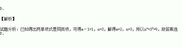 单项式xm﹣1y3与4xyn的和是单项式,则nm的值是( )