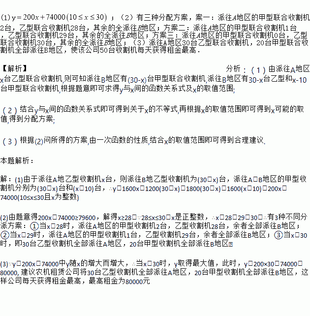 若使农机租赁公司这50台收割机一天所获租金不低于79600元,试写出满足条件的所有分派方案;