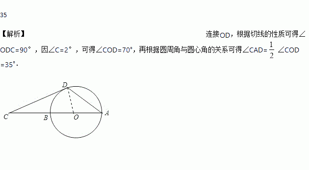 如图,AB是⊙O的直径,点C在AB的延长线上,CD与⊙O相切于点D,若∠C=20°,则∠CAD=_______°.