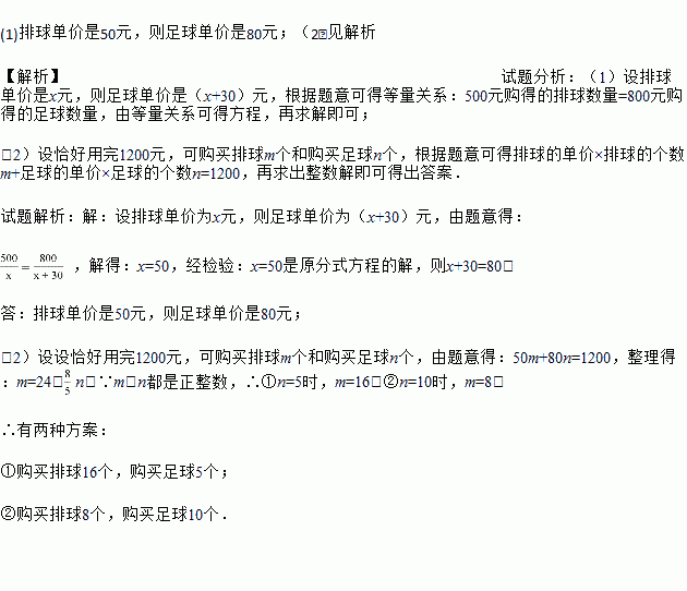 某班为满足同学们课外活动的需求,要求购排球和足球若干个.已知足球的单价比排球的单价多30元,用500元购得的排球数量与用800元购得的足球数量相等.