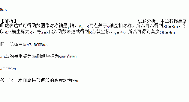 如图所示,拱桥是抛物线形,其函数表达式为y=-x2,当水位线在AB位置时,水面的宽AB是6 m,求这时水面离拱形顶部的高度OC.