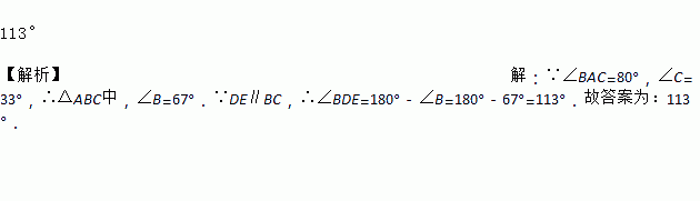 如图,△ABC中,点D在BA的延长线上,DE∥BC,如果∠BAC=80°,∠C=33°,那 么∠BDE的度数是__________.