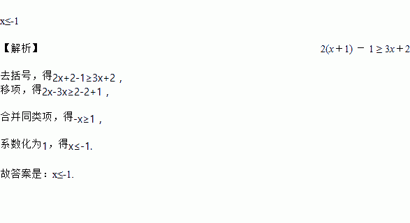 解不等式2(x+1) - 1 ≥ 3x+2,则不等式的解集为____.![]()