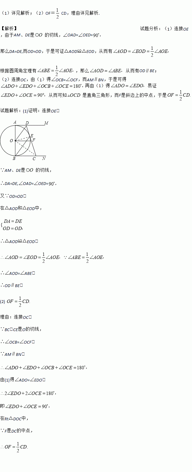 如图,AB是⊙O的直径,AM和BN是它的两条切线,DE切⊙O于点E,交AM于点D,交BN于点C,F是CD的中点,连接OF.