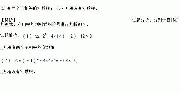 (1) 有两个不相等的实数根;(2)方程没有实数根. 【解析】试题分析:分别计算根的判别式,利用根的判别式的符号进行判断即可. 试题解析:(1)∵△=22﹣4×1×(﹣2)=12>0, ∴方程有两个不相等的实数根; (2)∵△=(﹣1)2﹣4×4×4=﹣63<0, ∴方程没有实数根.