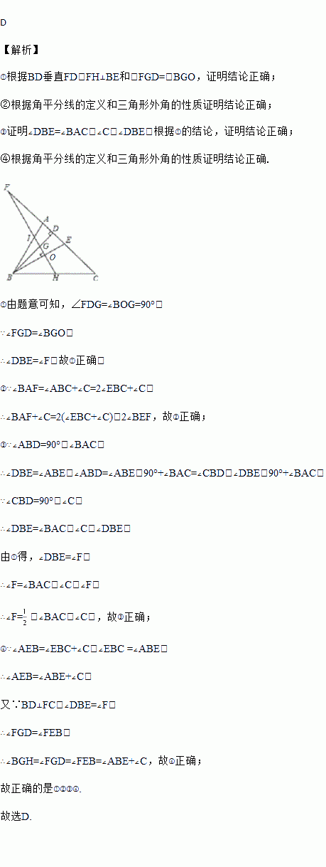 如图,在△ABC中,BD、BE分别是高和角平分线,点F在CA的延长线上,FH⊥BE交BD于G,交BC于H,下列结论:①∠DBE=∠F;②2∠BEF=∠BAF+∠C;③∠F=