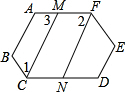 分析:设∠A=∠D=α,∠B=∠E=β,∠BCM为∠1,∠AMC为∠3,∠AFN为∠2,由六边形的内角和为720°得,2∠1+2∠2+2α+2β=720°由此得到∠1+∠2=360°-α-β,又在四边形ABCM中,∠1+∠3=360°-α-β故得:∠2=∠3,然后利用平行线的判定即可证明题目结论.