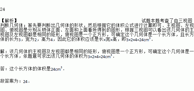 如图,是一个长方体的三视图(单位:cm),根据图中数据计算这个长方体的体积是_______cm3.
