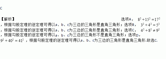 C 【解析】选项A, ,根据勾股定理的逆定理可得以a、b、c为三边的三角形是直角三角形;选项B, ,根据勾股定理的逆定理可得以a、b、c为三边的三角形是直角三角形;选项C, ,根据勾股定理的逆定理可得以a、b、c为三边的三角形不是直角三角形;选项D, ,根据勾股定理的逆定理可得以a、b、c为三边的三角形是直角三角形.故选C.