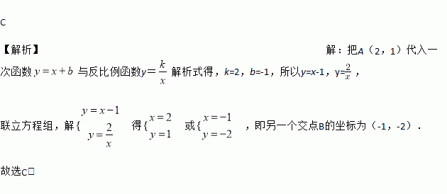 如图一次函数与反比例函数y=的图象相交于A,B 两点,若已知一个交点为A(2,1),则另一个交点B的坐标为( )