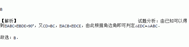 B 【解析】试题分析:由已知可以得到∠ABC=∠BDE=90°,又CD=BC,∠ACB=∠DCE,由此根据角边角即可判定△EDC≌△ABC. 故选:B.